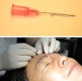 Dr.Spaオリジナル切らないたるみ治療「ファインフェイスアップ」とは、針(左写真)を顔全体に多数刺し、皮下にPDSという細い吸収糸を挿入し、血管や真皮層を刺激することで人体の自己治癒力を増強させコラーゲンの生成を誘導し続け、たるみの改善を行うものです。